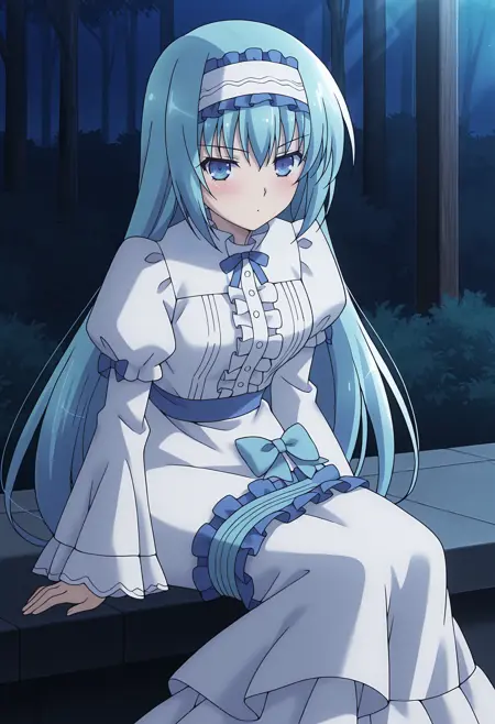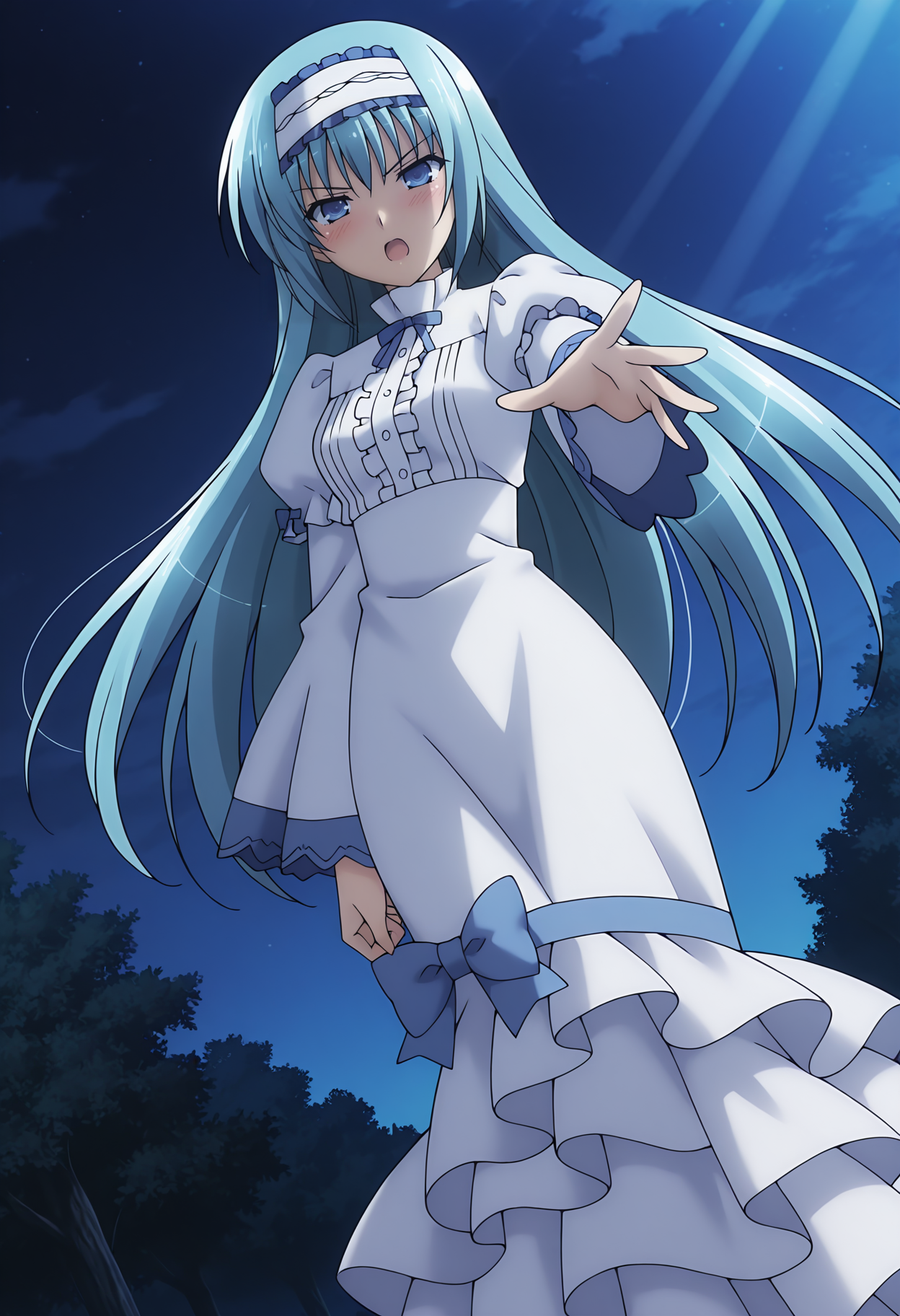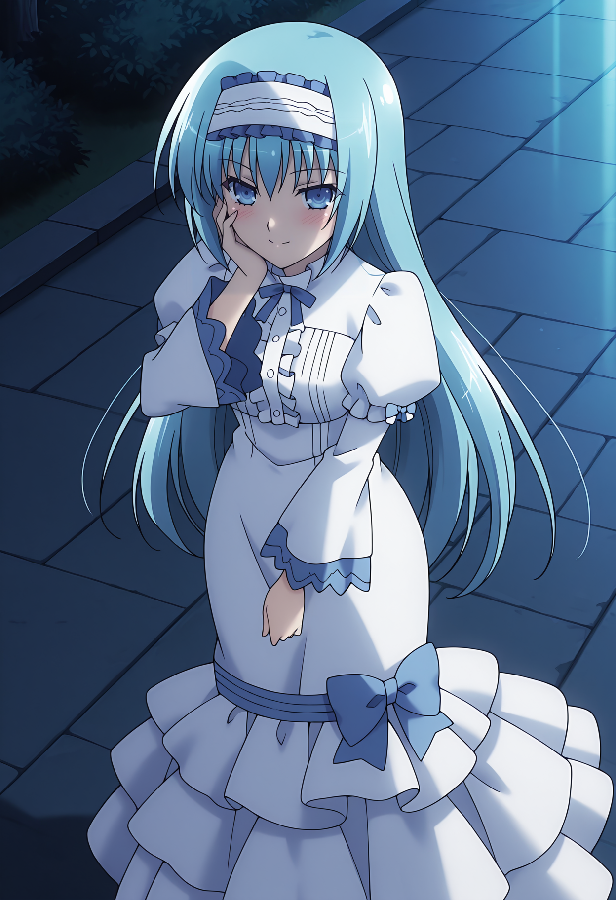 hairband, white dress, juliet sleeves, center frills, blue bow, long dress, layered dress,