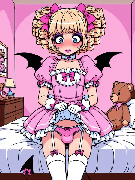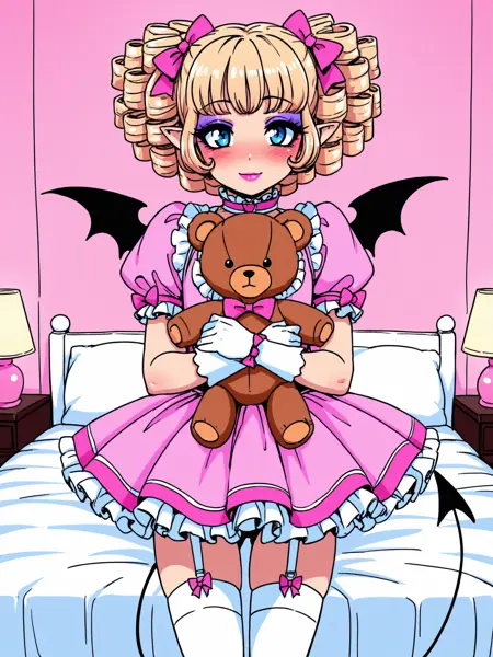 Sissyjoani服装与泰迪熊: - 蝴蝶结, 头发蝴蝶结, 粉色蝴蝶结, 连衣裙, 粉色连衣裙, 荷叶边连衣裙, 蓬松袖子, 短蓬松袖, 手套, 白色手套, 荷叶边, 裙子, 内衣, 吊袜带, 过膝袜, 白色过膝袜 - 女仆装, 女仆头饰, 连衣裙, 黑色连衣裙, 朱丽叶袖, 蓬松袖, 长袖, 围裙, 腰部围裙, 过膝袜, 黑色过膝袜, 高跟鞋 - 毛绒玩具, 毛绒动物, 泰迪熊