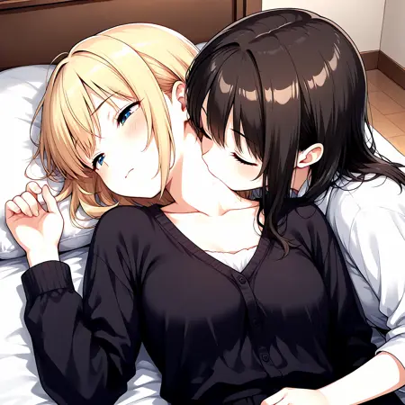 2girls, face on neck, (kissing neck:0.3), lying, shirt