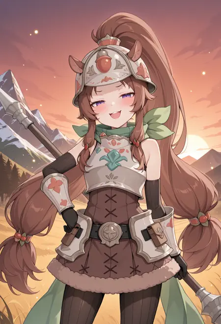 - pcriran, ponytail, helmet, green scarf, brown dress, fur-trimmed dress, sleeveless, bare shoulders, breastplate, black belt, hip armor, elbow gloves, black gloves, vambraces, brown dress, black pantyhose, ribbed pantyhose,
