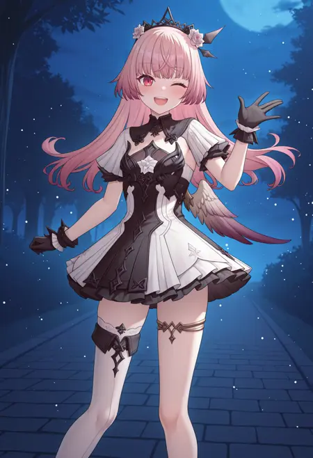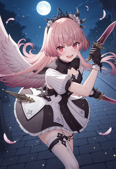 asleror, 黑色发冠, 头发花朵, 白色袖子, 黑色领子, 短袖, 双色连衣裙, 黑色连衣裙, 白色连衣裙, 黑色手套, 大腿带, 大腿绑带, 单侧过膝袜, 翅膀,
