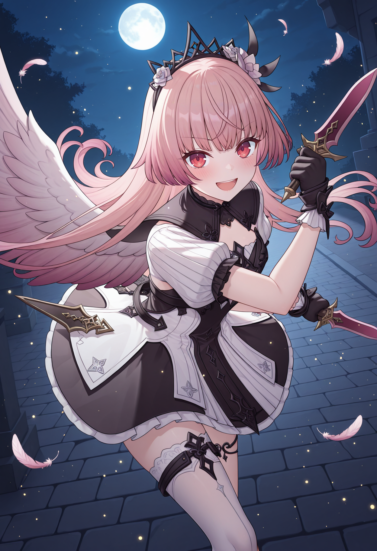 asleror, black tiara, hair flower, white sleeves, black collar, short sleeves, two-tone dress, black dress, white dress, black gloves, thighlet, thigh strap, single thighhigh, wings,