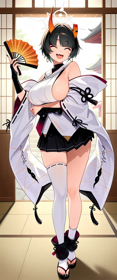 sideless sleeveless white kimono, black undershirt, sideboob, single bridal gauntlet, wide detached long sleeves, black sash, black hakama short skirt, ribbon-trimmed clothes, toeless uneven legwear, single white thighhigh, single white sock, ankle guards, black okobo,