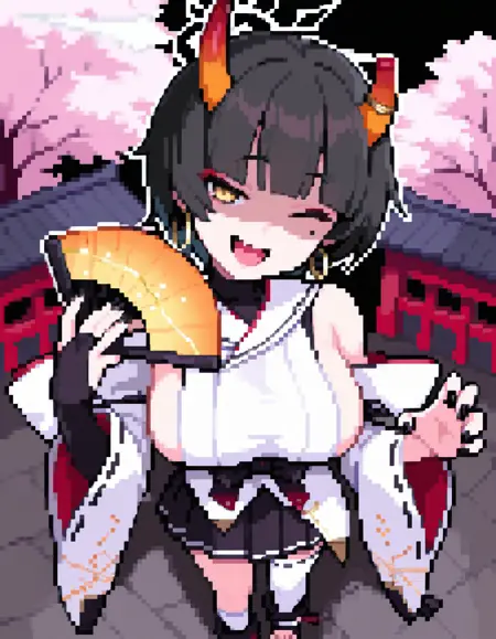 amachin1y4, mole under eye, black hair, short hair, multicolored horns, red horns, orange horns, broken horn, single horn ring, hoop earrings, makeup, white halo, black nails, large breasts, closed eyes, ^ ^,