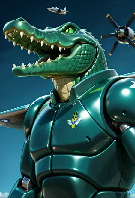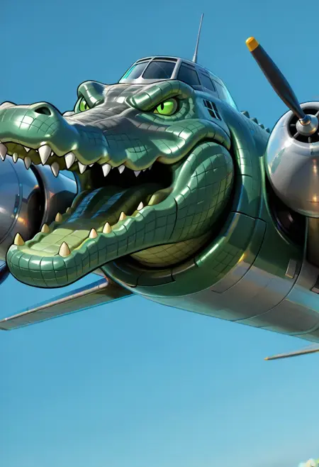 BombardiroCrocodilo, 1boy, mecha, hybrid bomber aircraft with the front resembling a green crocodile, sharp teeth, metallic body, reptilian features, green eyes, floating