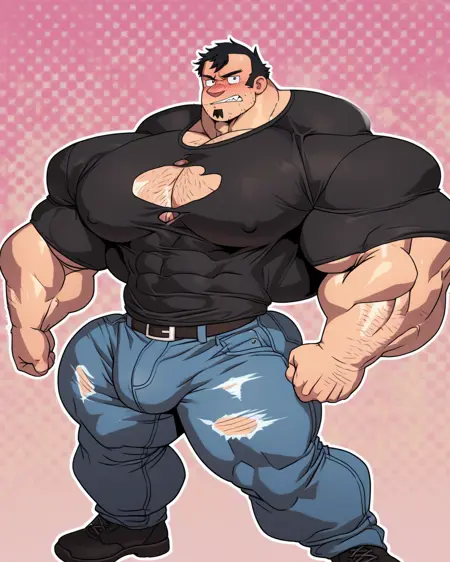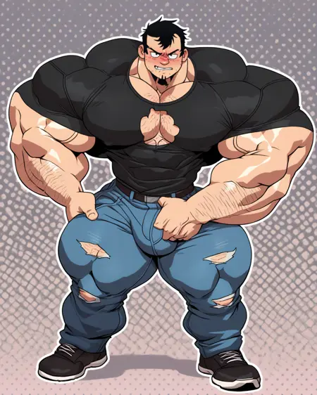 Trigger Word: Remertdan, art by remert, dan mandel, dan vs, short hair, black hair, facial hair, stubble, bara, muscular, extremely muscular, hyper muscles,