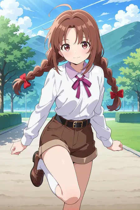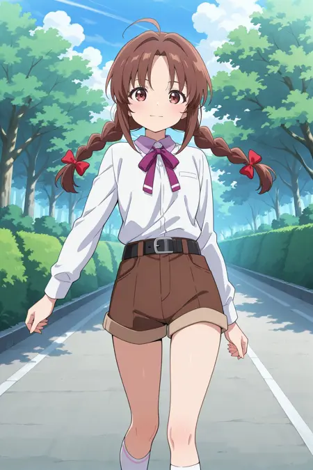 hair bow, red bow, purple neck ribbon, collared shirt, white shirt, long sleeves, black belt, brown shorts, white socks, kneehighs, brown shoes, loafers,