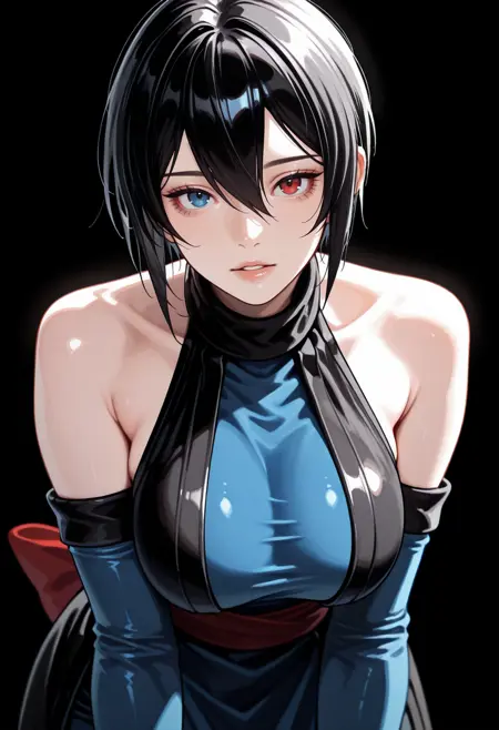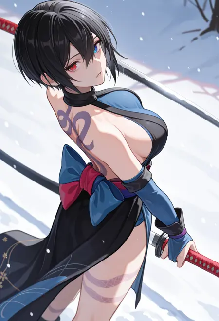 "SHIKSAMSH、黒髪、短髪、眉間の髪、虹彩異色症、青い目、赤い目、和服、肩出し、多色の服、重ね着、袖外し、多色の帯、足のタトゥー、リボン、骨盤カーテン、指先部分が開いた手袋"