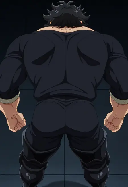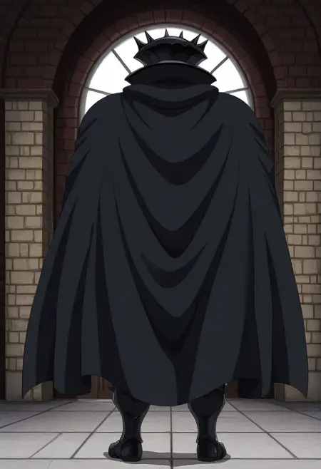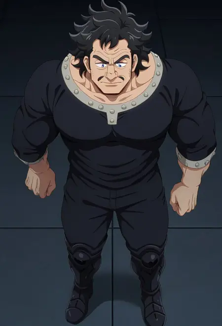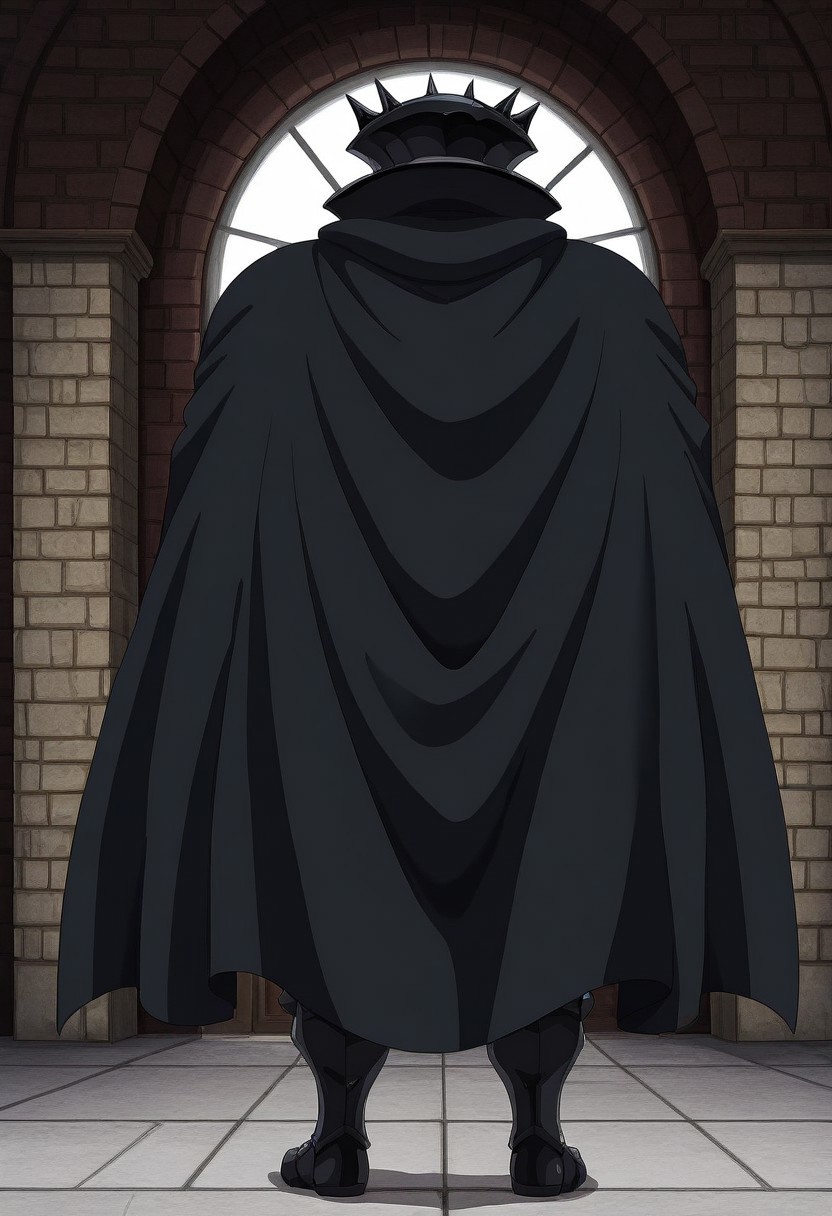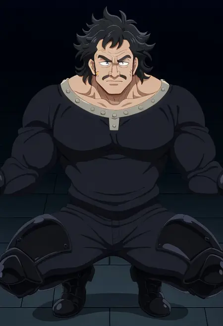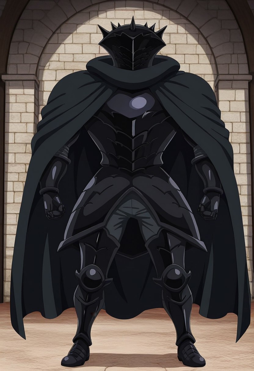 Pellegarde, solo, male, man, dark blue eyes, black eyebrows, black hair, short, very messy and thick, with spiky locks, black mustache, black shirt, black pants, boots/greaves, knight armor, black knight helmet, long black cloak