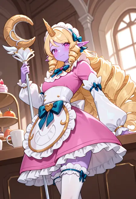 soraka_cc,1girl,solo,金色头发,长发,螺旋发,尖耳,粉红色眼睛,有色皮肤,紫色皮肤,单角,发带,蓝色蝴蝶结,女仆,粉色连衣裙,长袖,蓬松袖子,蓝色领结,围裙,花边,女仆头饰,白色过膝袜,鞋子,黑色鞋履,(法杖,手持法杖:1.2),