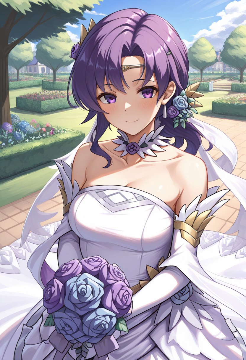 JunoFE, alt2Juno, purple eyes, purple hair, bare shoulders, bouquet, bridal veil, circlet, hair ornament, wedding dress, collarbone
