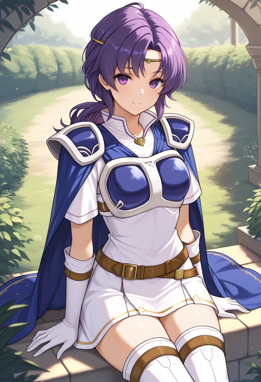 JunoFE, defJuno, purple eyes, purple hair, zettai ryouiki, thigh boots, shoulder armor,white short dress, breastplate, belt, elbow gloves, pauldrons, blue cape, white footwear, short sleeves, shoulder pads, white skirt, circlet, white thighhighs