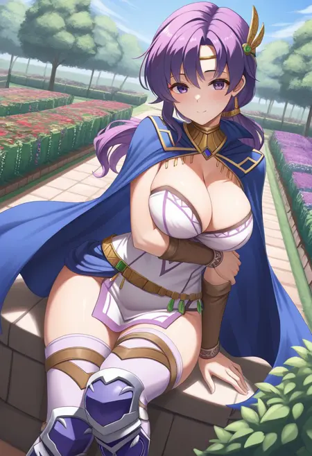 JunoFE, alt3Juno, purple eyes, purple hair, hair ornament, knee armor, blue cape, circlet, hair ornament, thighhighs