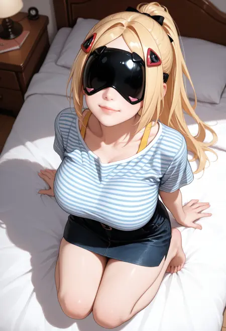 (Positive Prompts) ztrigger, large breasts, blonde hair, long hair, ponytail, parted bangs, eye mask,