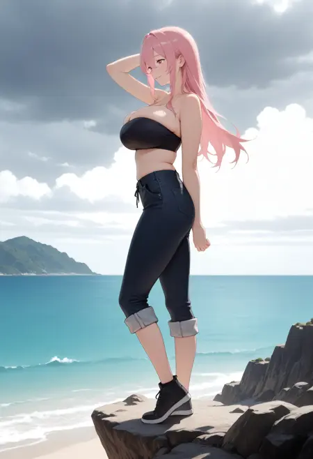 (肯定的プロンプト) zyanagi, large breasts, pink eyes, long hair, pink hair, hair between eyes, sidelocks,