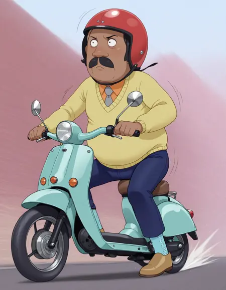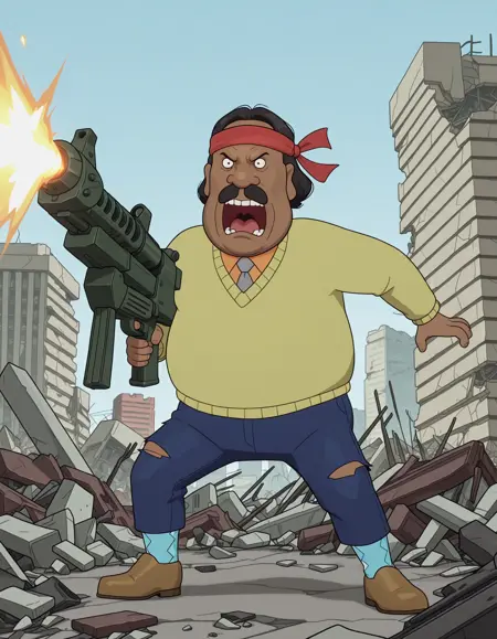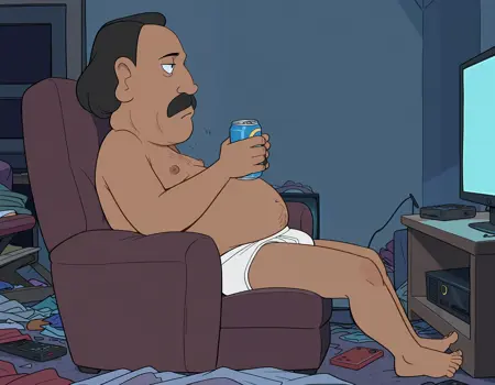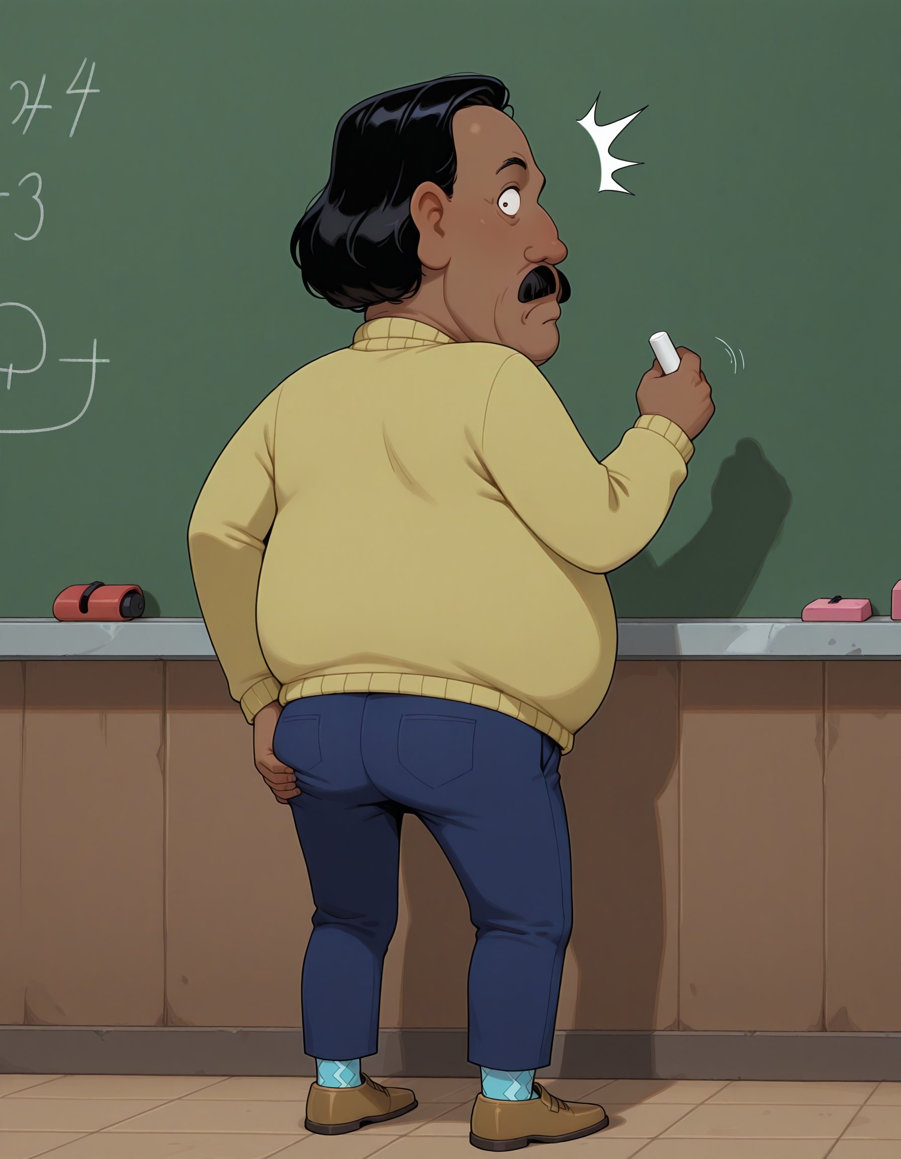 Triggers: rnm_mrgoldenfold, 1boy, solo, fat man, dark-skinned male, black hair, mustache, yellow sweater, orange undershirt, grey tie, blue pants, aqua argyle socks, brown footwear