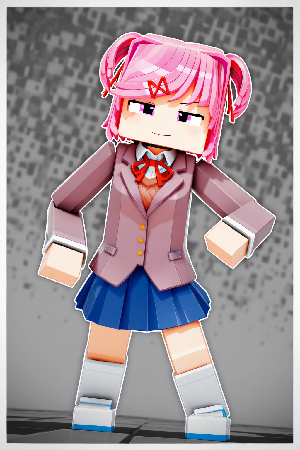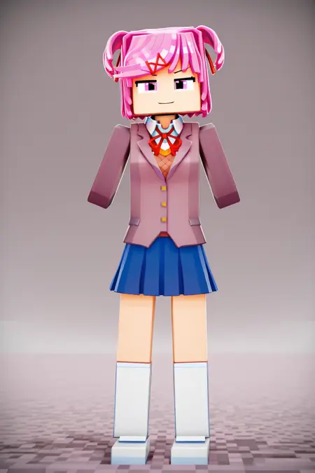 | 训练词汇 | ZaminationNatsuki, 1girl, vibrant short pink hair, vibrant magenta eyes, purple-brown blazer, red neck ribbon, blue skirt, white socks, white shoes, hair ornament, brown sweater, square arms, square body, natsuki (doki doki literature club), minecraft (style),已复制! |