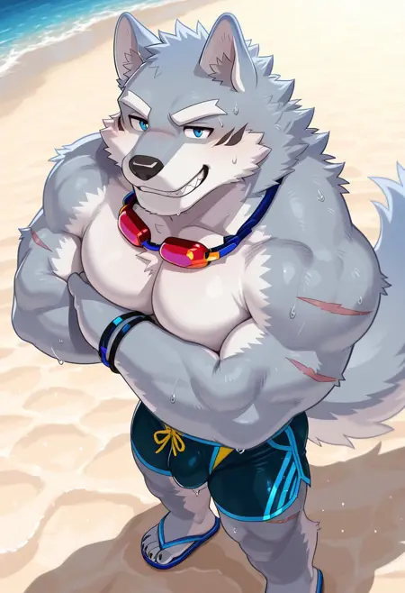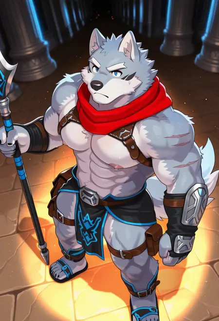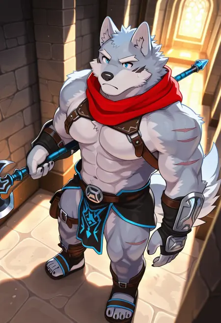 强化提示:“狼男孩,毛茸茸,尾巴,蓝眼睛,肩部疤痕,腿部疤痕,肌肉发达,健壮体型,宽大胸肌”