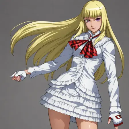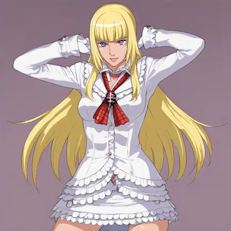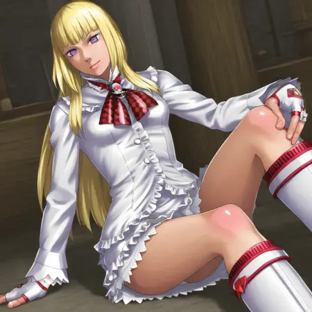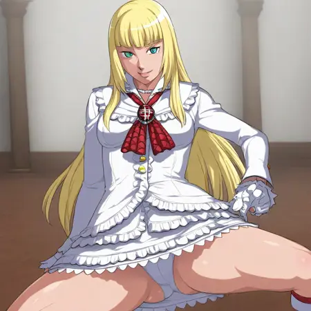 For the prompt use: 1girl, underwear, solo, panties, blonde hair, long hair, fingerless gloves, frills, purple eyes, white gloves, skirt, white dress, boots, knee boots, large breasts