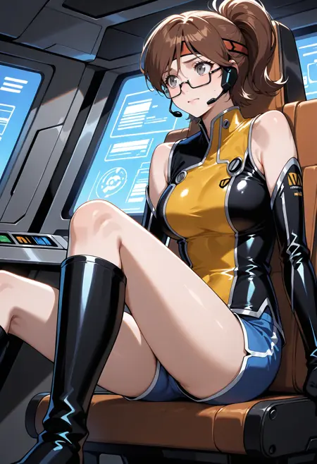 推奨される要素:1人の女の子、眼鏡、茶色の髪、ポニーテール、手袋、肘まである手袋、ヘッドバンド、裸の肩、セミリムレス眼鏡、灰色の目、アンダーリム眼鏡、ボディスーツ、短い髪、ヘッドセット、胸、ブーツ、ショートパンツ、取り外し可能な袖、青いショートパンツ、黒枠眼鏡、膝上ブーツ、黒い靴、短いショートパンツ、ノースリーブ、茶色の目、長い袖
