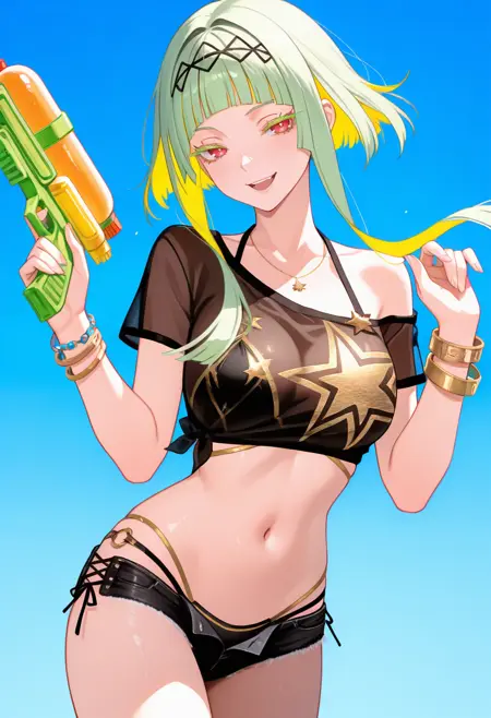 - I really recommend against using prompts such as "upper body" "close up" etc, when using this lora. If you want your gens to focus on specific sections of the body, you're better off removing clothing tags such as "multi-strap bikini, short shorts"