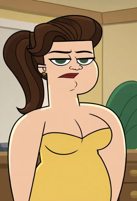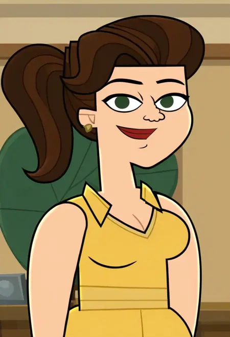 Trigger words: 1girl, solo, Grett_DC, fair skin, long wavy hair, dark brown hair, ponytail, yellow pearl earring, dark green eyes, red lips, gold bracelets