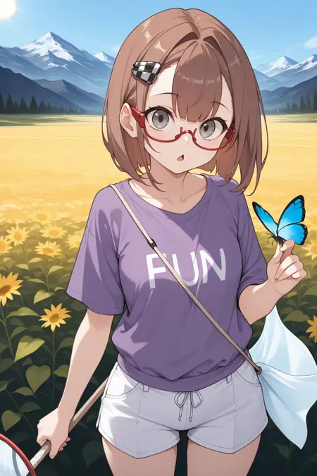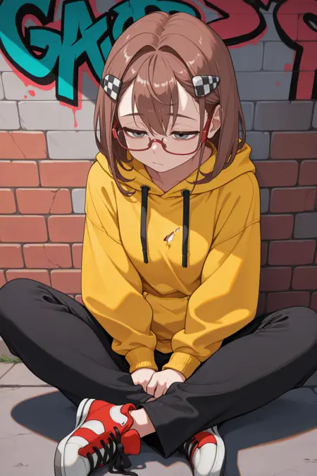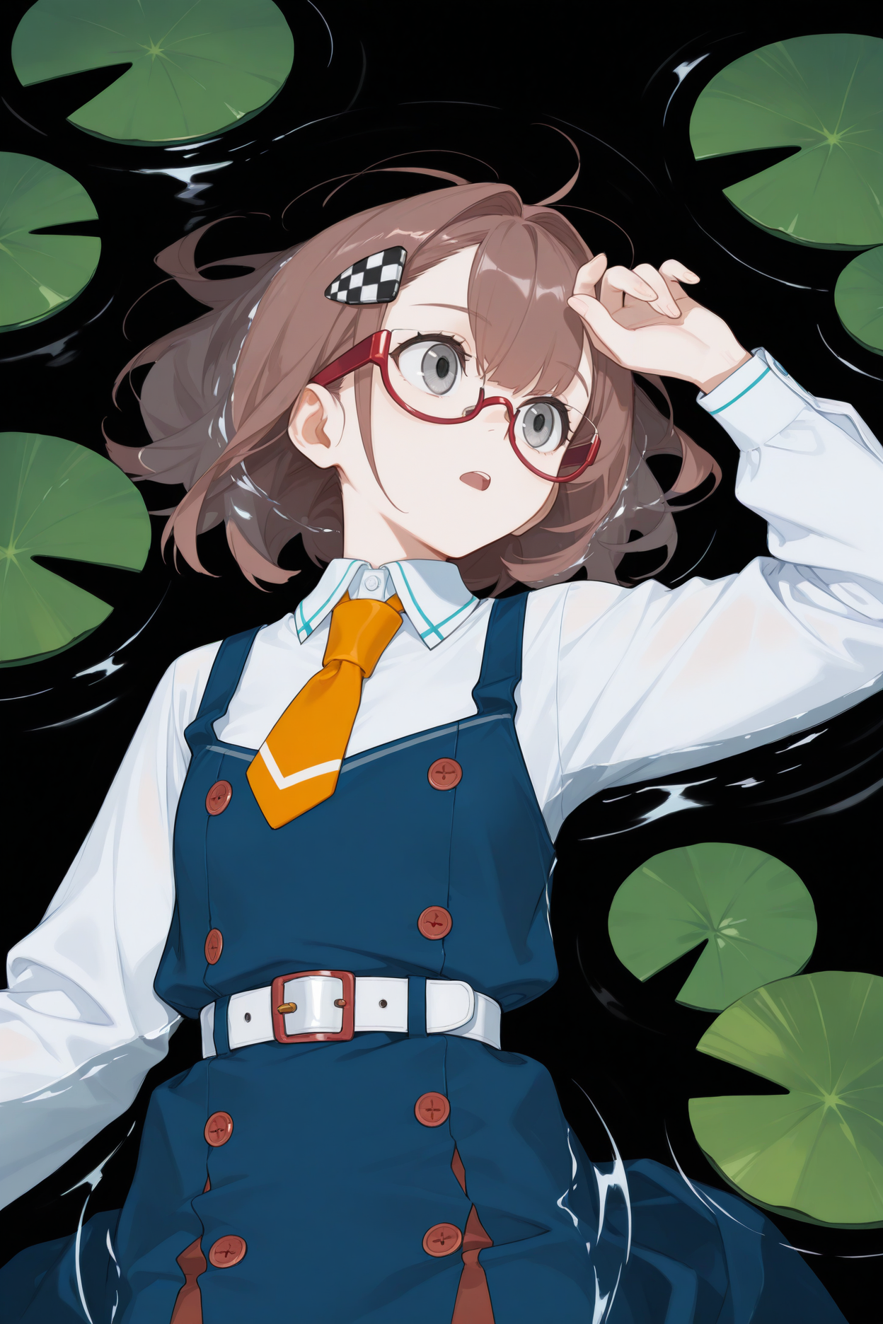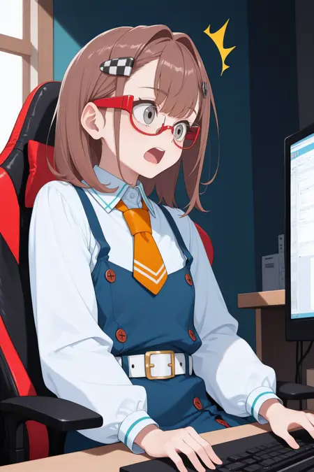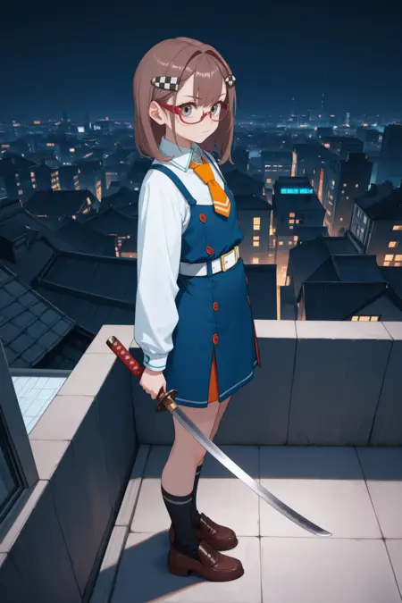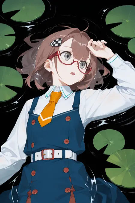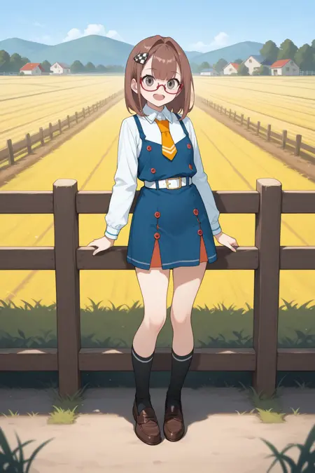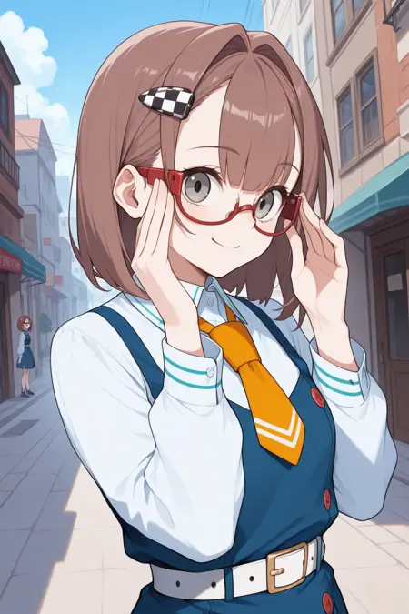Add "red glasses, semi-rimless eyewear, checkered hairclip, orange necktie, white shirt, long sleeves, pinafore dress, blue dress, white belt, black socks, loafers" for her typical look.