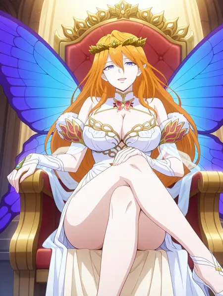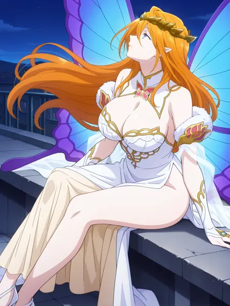 Clothes: gold laurel crown, fairy white dress, long dress, long beige underskirt, bare hips, side cutouts, gold trim, blue gems, gold details, pink details, clothing cutout, high collar, detached collar, butterfly ornament, bare shoulders, cleavage cutout, detached sleeves, puffy sleeves, white bridal gauntlets, fingerless gauntlets, fairy wings, blue-purple wings, gradient-wings, open toe heels, white low heels,