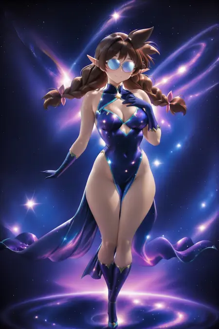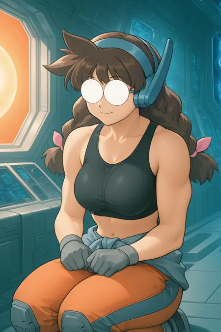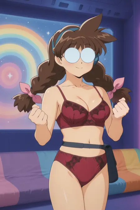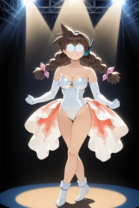 메인 프롬프트: Parfet_Balblair, 갈색 머리, 긴 머리, 땋은 머리, 쌍 땋은 머리, 코카콜라 병 안경, 불투명 안경, 큰 가슴,