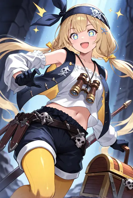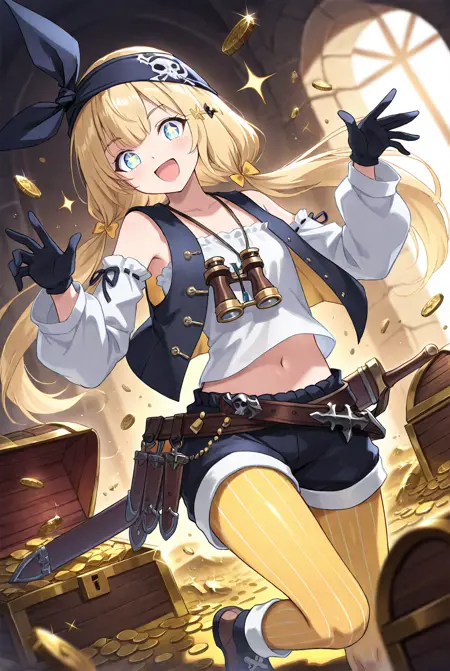 blue eyes , ( sparkling eyes ) , blonde hair , ahoge , ( low ) twintails , ( black ) headband , ( skull print ) , ( black ) vest , hair ornament , bow , decorations , white shirt / tank top , (navel ) , shoulder cutout , long sleeves , ( black ) gloves , ( black ) shorts , fur trim , ( yellow ) pantyhose , ( vertical-striped pantyhose ) , ( boots ) , sheath , belt , pockets , binoculars / telescope ;