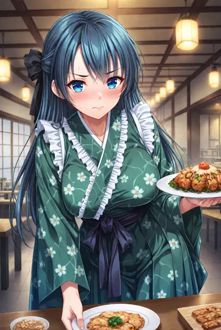 - ( purple ) hair bow ,frills , japanese clothes , green dress , plaid dress , ( dark blue ) hakama skirt ;