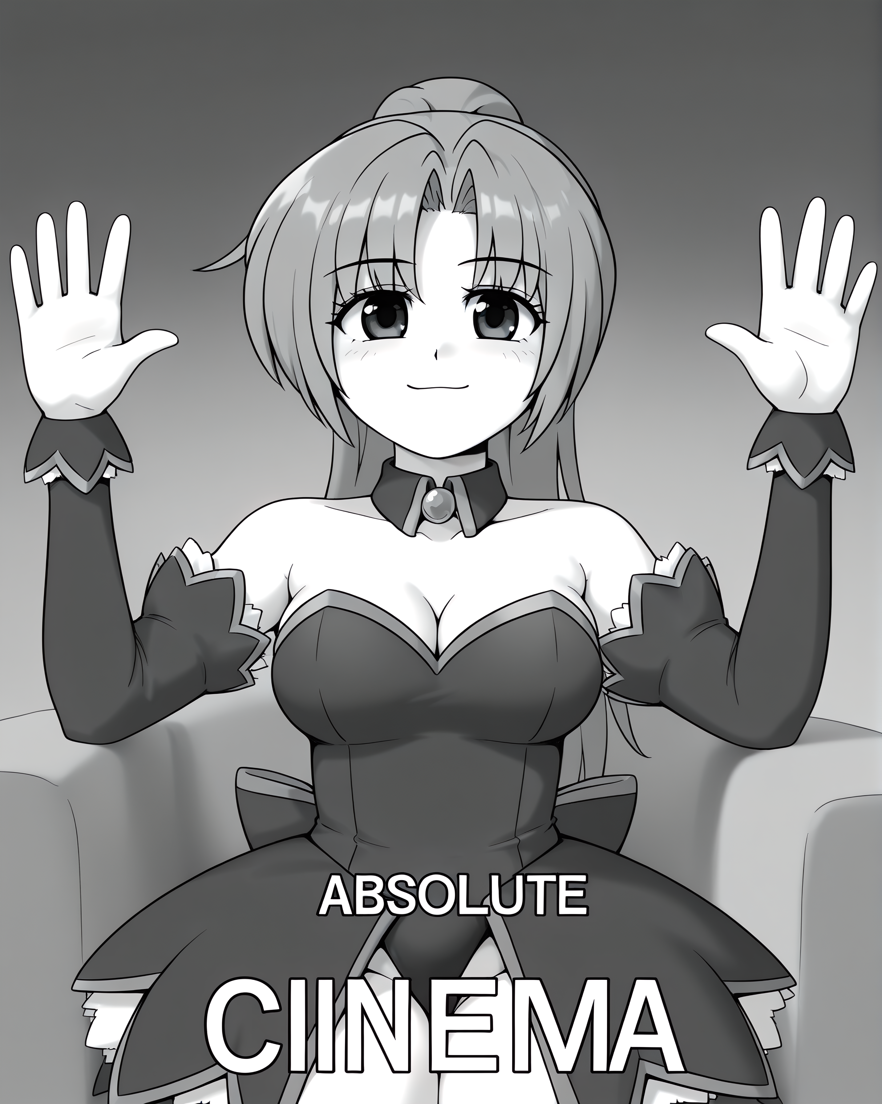 mionsonozaki, consolestyle, kizunaeyes, high ponytail, angel mort, cleavage, bare shoulders, choker, black thighhighs, leg ribbon, red heels