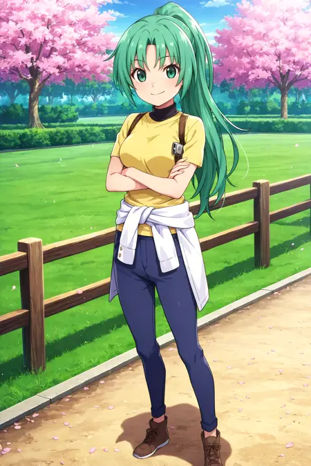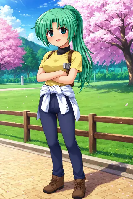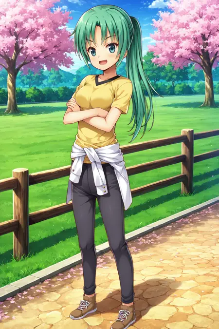 mionsonozaki, meigoustyle, anime coloring, anime screencap, green eyes, high ponytail, shiny hair, yellow shirt, black neck, white clothes around waist, blue pants, brown shoes