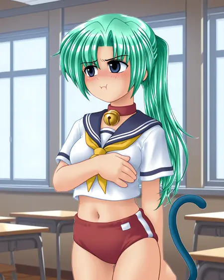 mionsonozaki, meigoustyle, anime coloring, anime screencap, green eyes, high ponytail, shiny hair, serafuku, yellow neckerchief, midriff, navel, red buruma, neck bell, blue sailor collar, cat tail