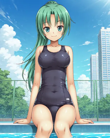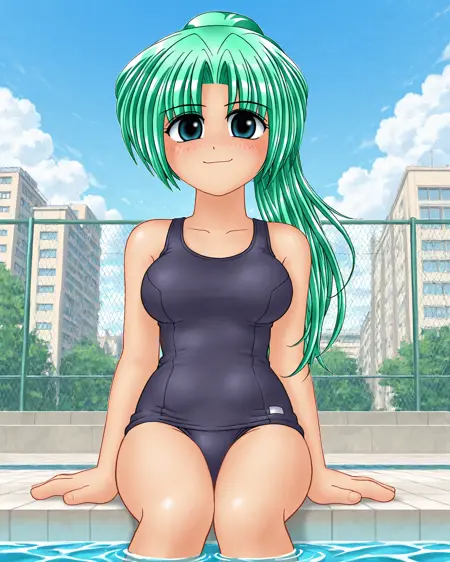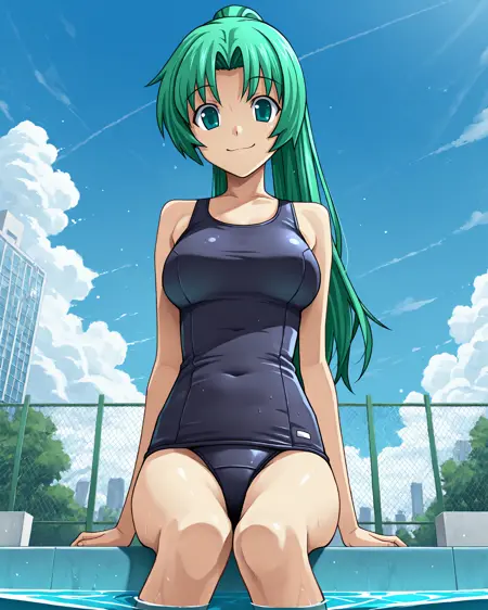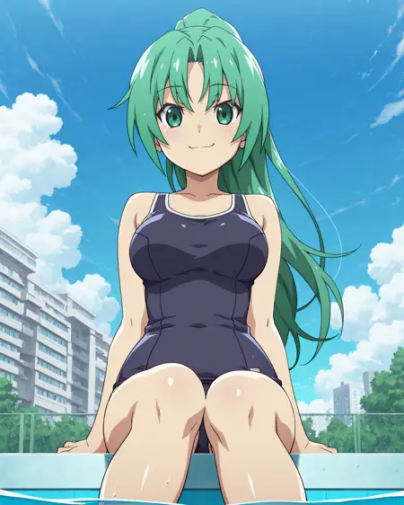 mionsonozaki, meigoustyle, anime coloring, anime screencap, green eyes, high ponytail, shiny hair, blue one-piece swimsuit, school swimsuit