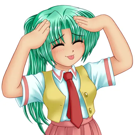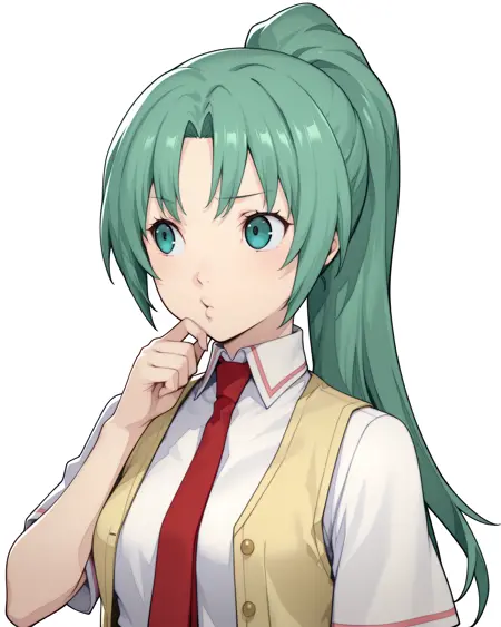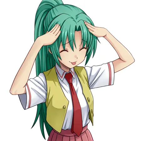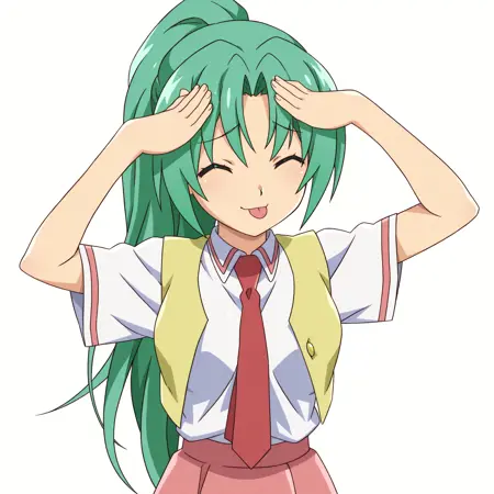 mionsonozaki, meigoustyle, anime coloring, anime screencap, green eyes, high ponytail, shiny hair, shirt button, yellow vest, red necktie, white shirt, pink skirt, long skirt, black socks, brown shoes