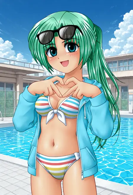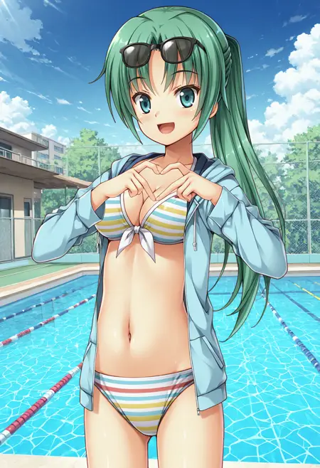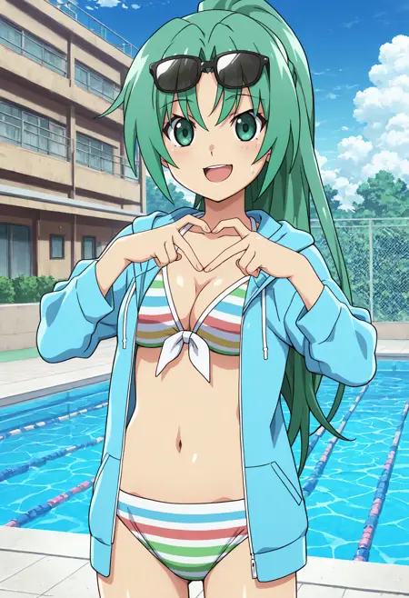 mionsonozaki, meigoustyle, anime coloring, anime screencap, green eyes, high ponytail, shiny hair, striped bikini, white straps, eyewear on head, blue hoodie, open clothes, jacket over swimsuit, navel