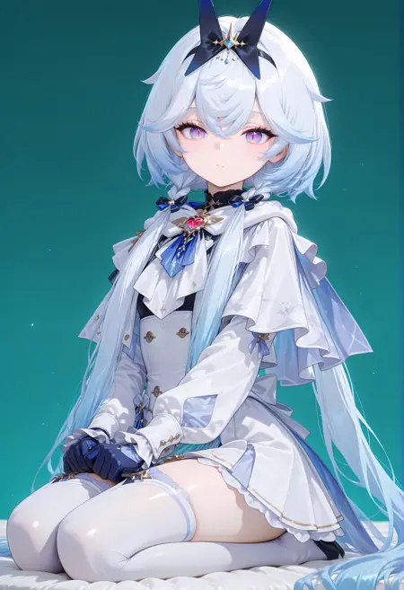 dress thighhighs, blue gloves, hair ornament, long sleeves , capelet,