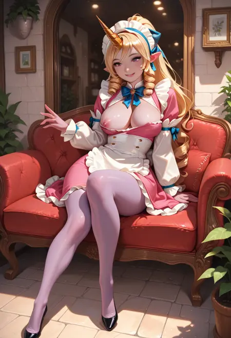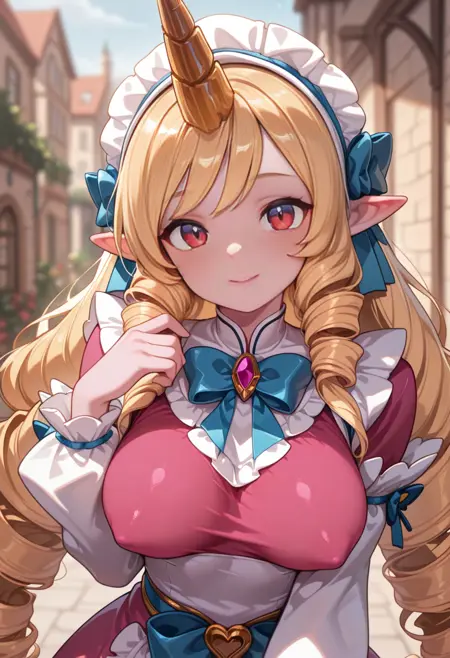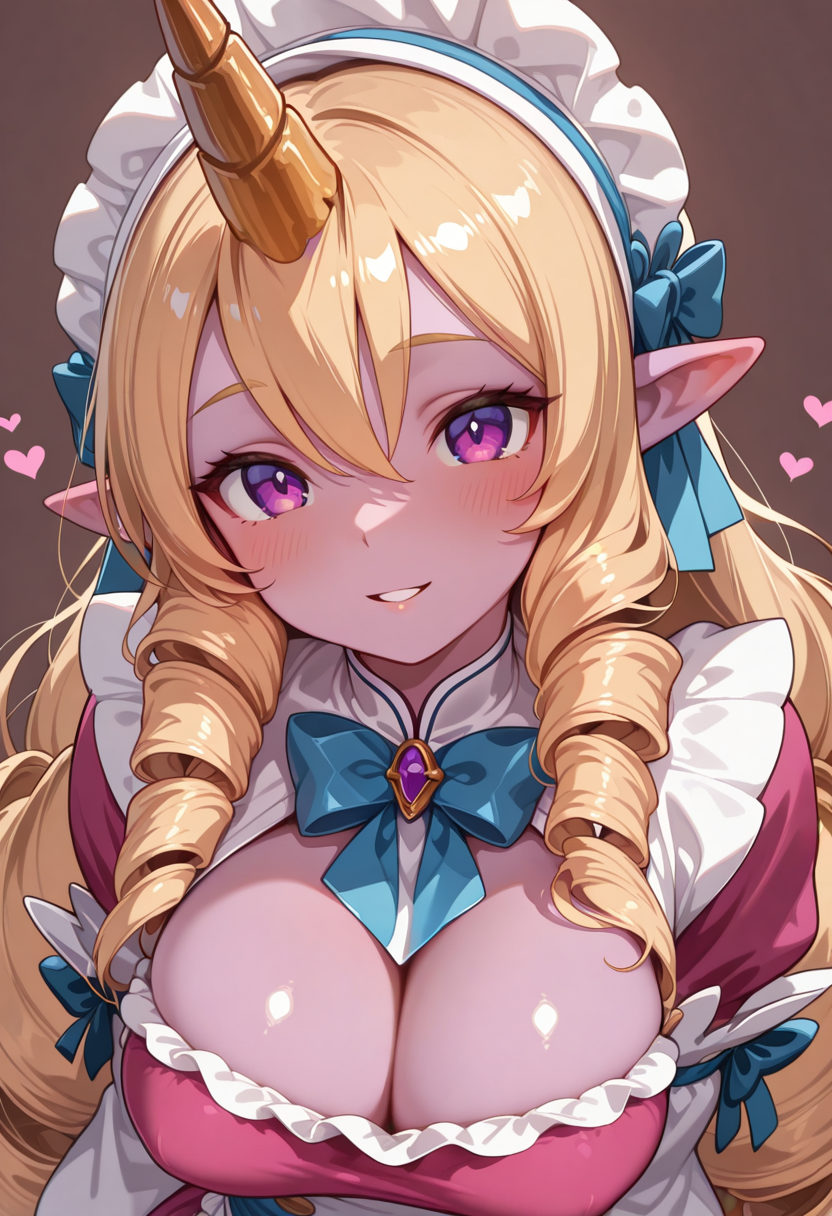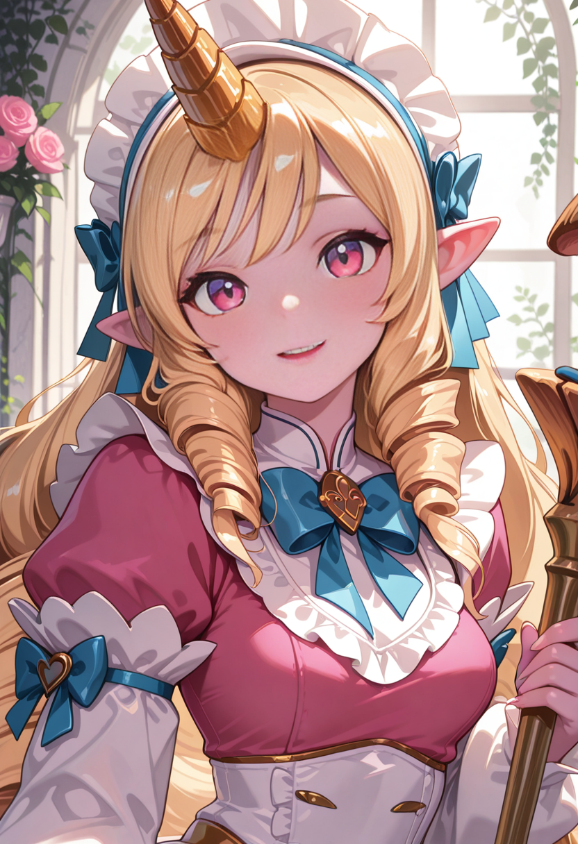 トリガー: caf3cuti3ssor1k1, 1girl, long hair, blonde hair, maid headdress, breasts, pointy ears, single horn, dress [ Your Prompt ]