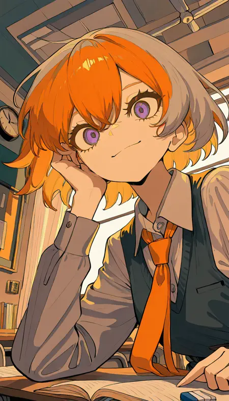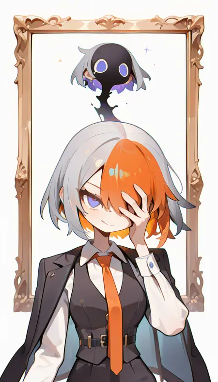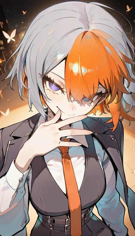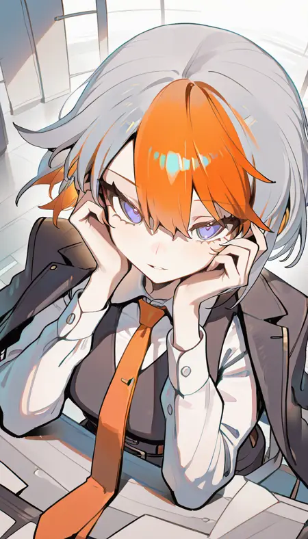 - OffOfficer, 1girl, 多色头发, 橙色头发, 短发, 黑色高光, 橙色领带, 夹克搭在肩上, 白色衬衫, 有领衬衫, 背心, 超短裙, 连裤袜,