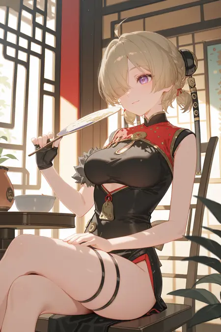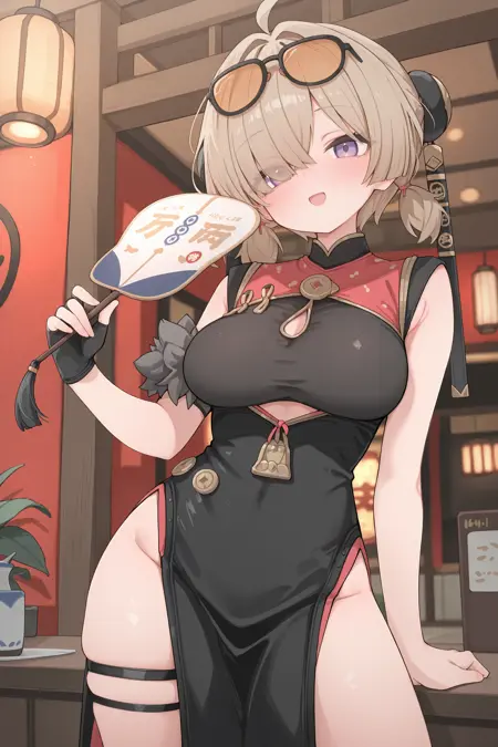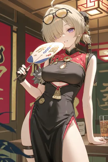 其默认游戏内女仆服装的附加提示词:头发遮住一只眼睛、低双马尾、双发髻、发豆、眼镜戴在头上、墨镜、单人、无袖旗袍、单只露指手套、毛边臂环、大腿绑带、脚踝链、方跟鞋