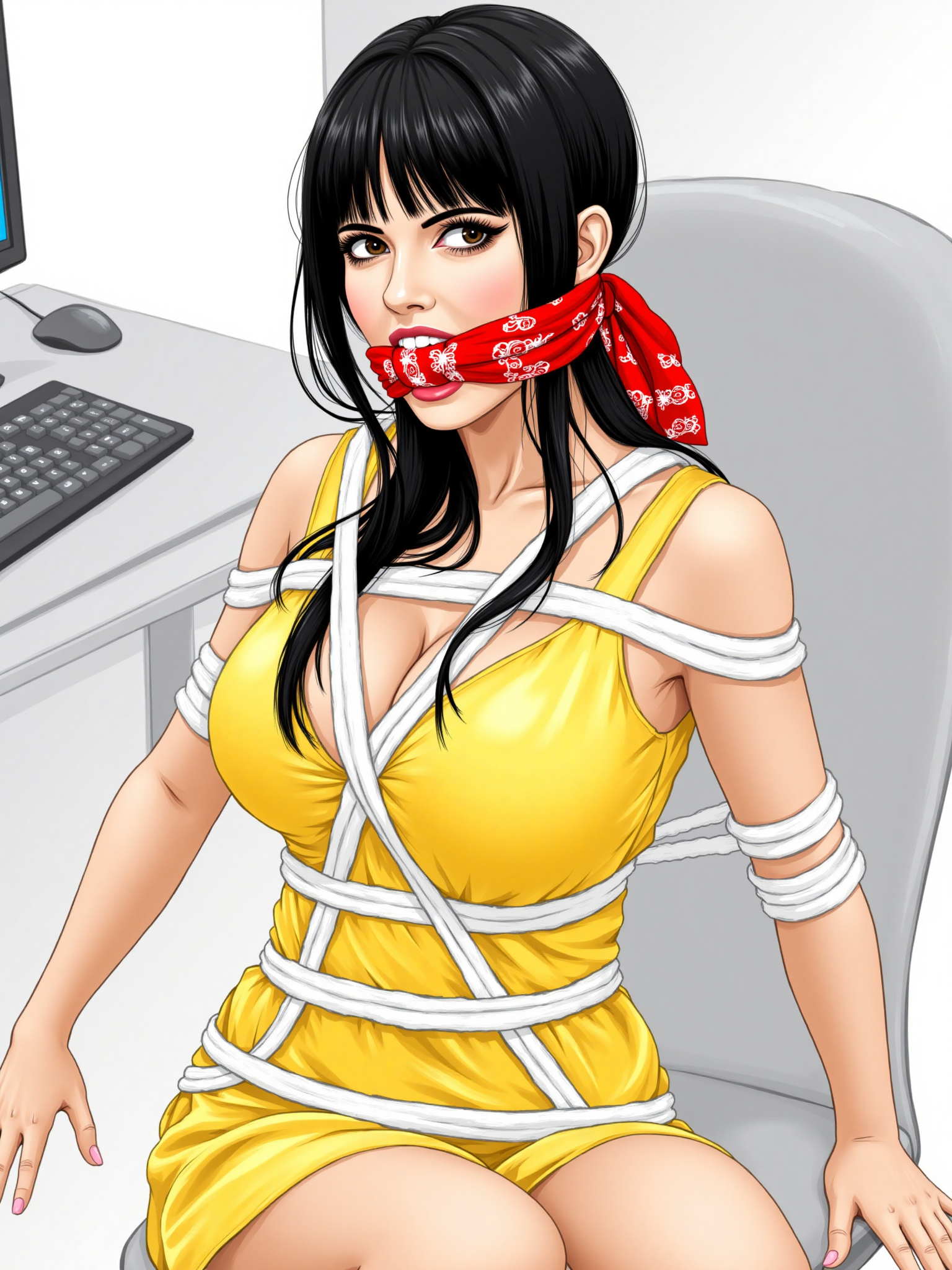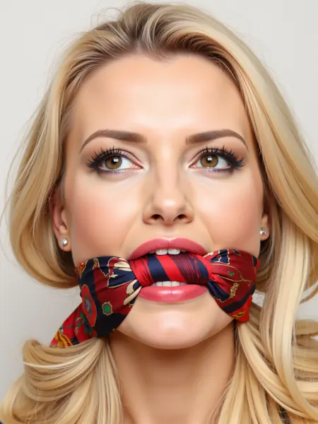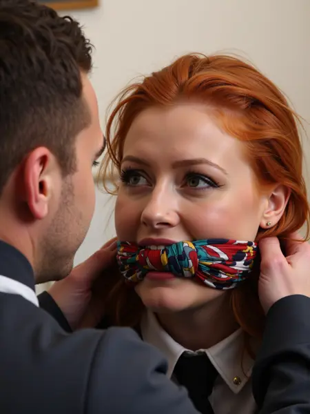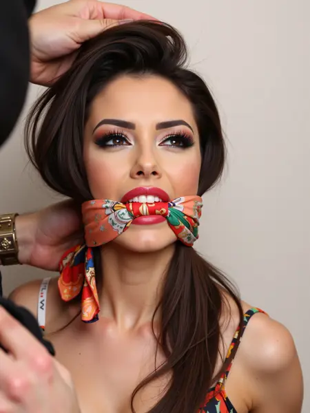 The scarf can be also over the hair (try prompting that - still not very consistent) and it can also produce a man applying the gag (needs work on that).