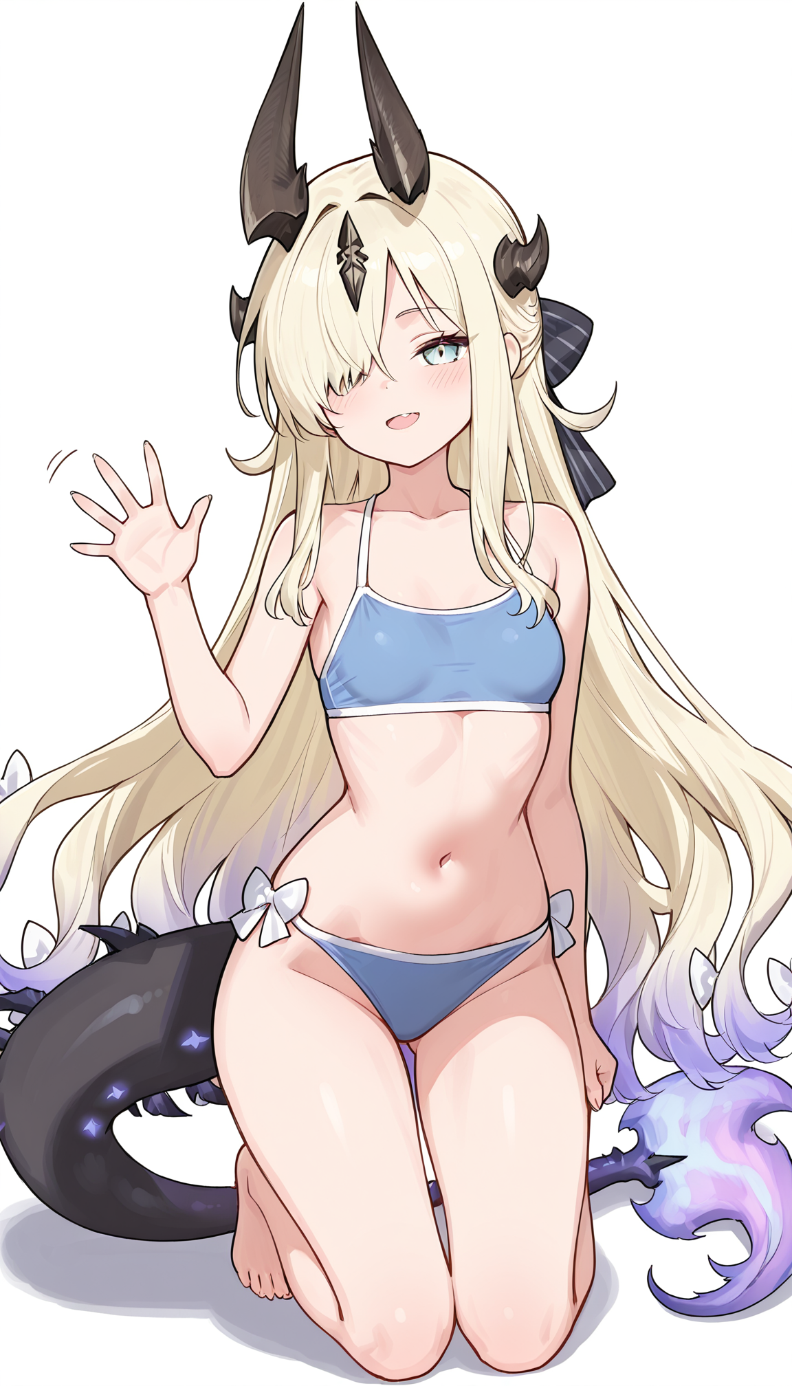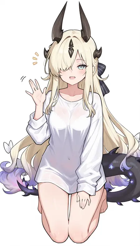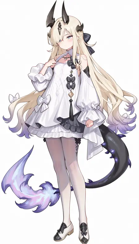 1girl,Eblana,dragon girl,solo,white dress,black bow,hair bow,white bow,white pantyhose,shoes, white footwear, long sleeves,bare shoulders,simple background,white background,