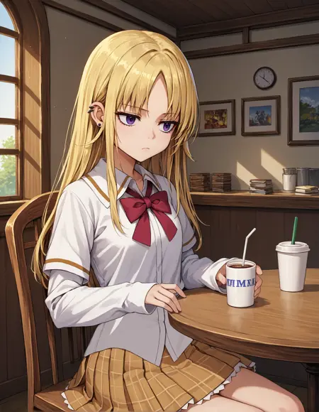 Casual outfit: mgrcyukinokanae, knecsl, long hair, white shirt, red bowtie, (short over long sleeves), sleeves past wrists, yellow pleated skirt