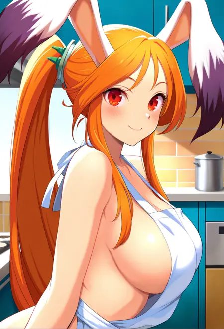 MomoBOF,rabbit girl,rabbit ears,orange hair,very long hair,twin braids,low tied,red eyes,glasses,large breasts