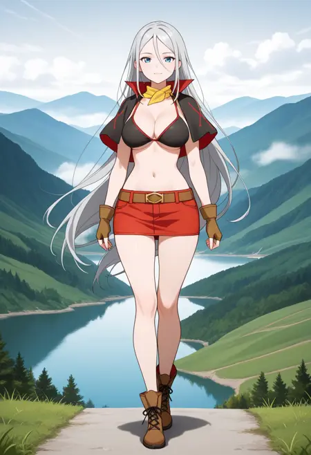 Outfit: red skirt, miniskirt, bikini top only, black bikini, black capelet, yellow scarf, midriff, navel, brown gloves, fingerless gloves, brown footwear, cross-laced footwear, ankle boots, white pantyhose