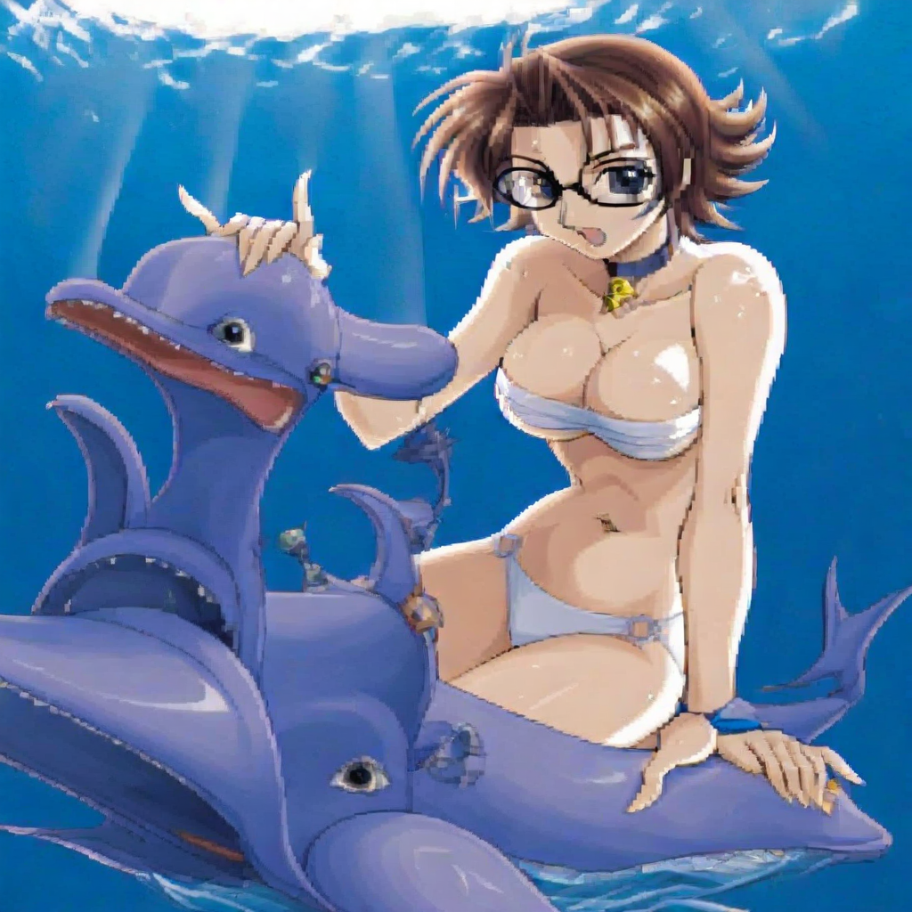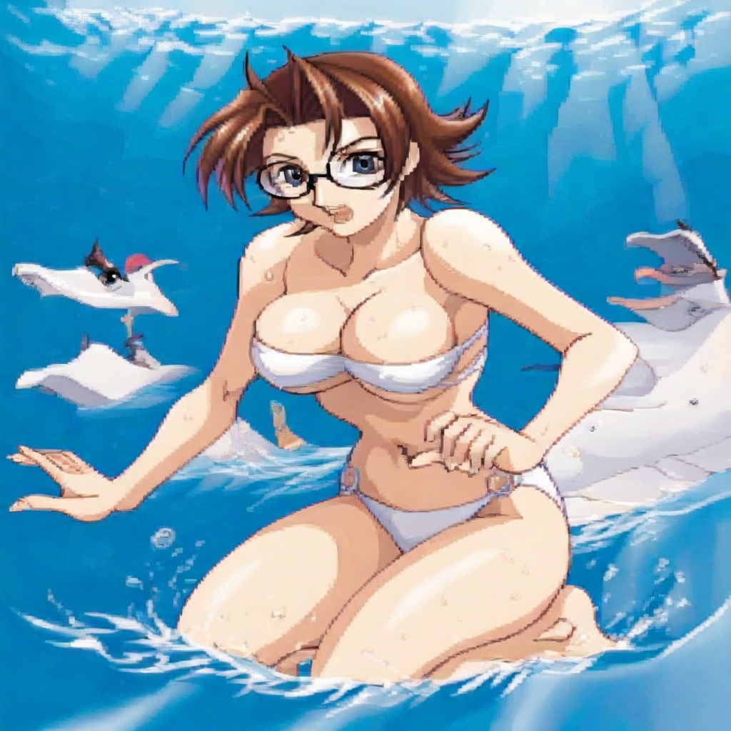 swimsuit kiriko_tōkidenshō, 1girl, swimsuit, bikini, solo, glasses, brown hair, white bikini, short hair, breasts, large breasts