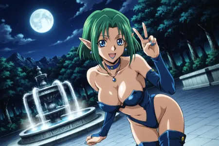 yugioh_card_style, yugioh_card_for_old_water_girl, 尖耳朵, 绿发, 蓝眼, 短发, 蓝唇, 蓝色指甲, 指甲油, 耳环, 项链, 大胸, 胸部沟壑, 锁骨, 肚脐, 微笑, 蓝色项圈, 蓝色紧身衣, 婚礼护腕, 蓝色大腿靴