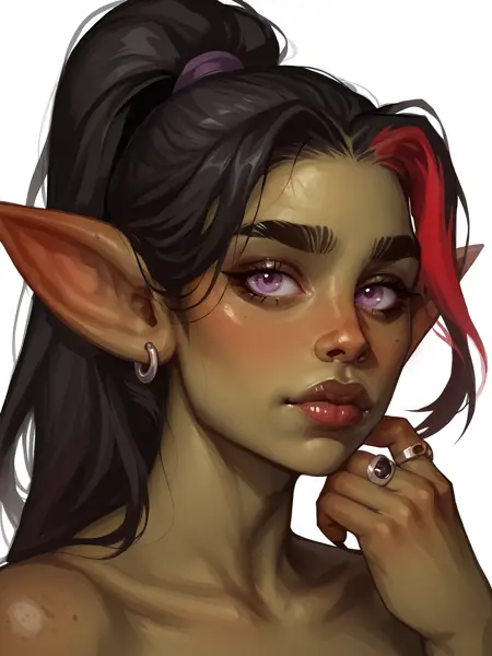 purple eyes, pointed ears, ponytail, black hair, red bang, red highlights, green skin, colored skin