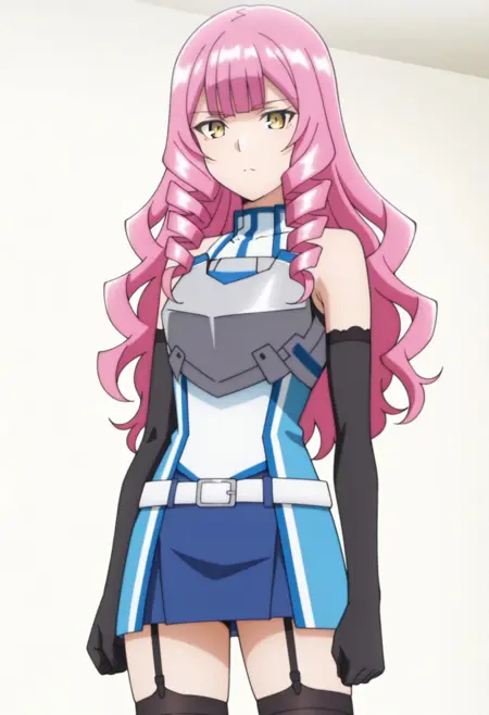 白色连衣裙,白衬衫,蓝衬衫,彩色衬衫,钢制胸甲,蓝色迷你裙,黑色肘套,吊袜带,露肩,白色腰带,蓝色腰带,黑色过膝袜